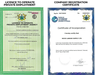 Nicks Travel & Labor supply Ltd is a trusted provider of travel and labor supply services, dedicated to connecting businesses with skilled professionals and offering seamless travel experiences. With a strong presence in Ghana and the UAE, we specialize in providing high-quality manpower solutions, ensuring efficiency and reliability in every service we offer.
